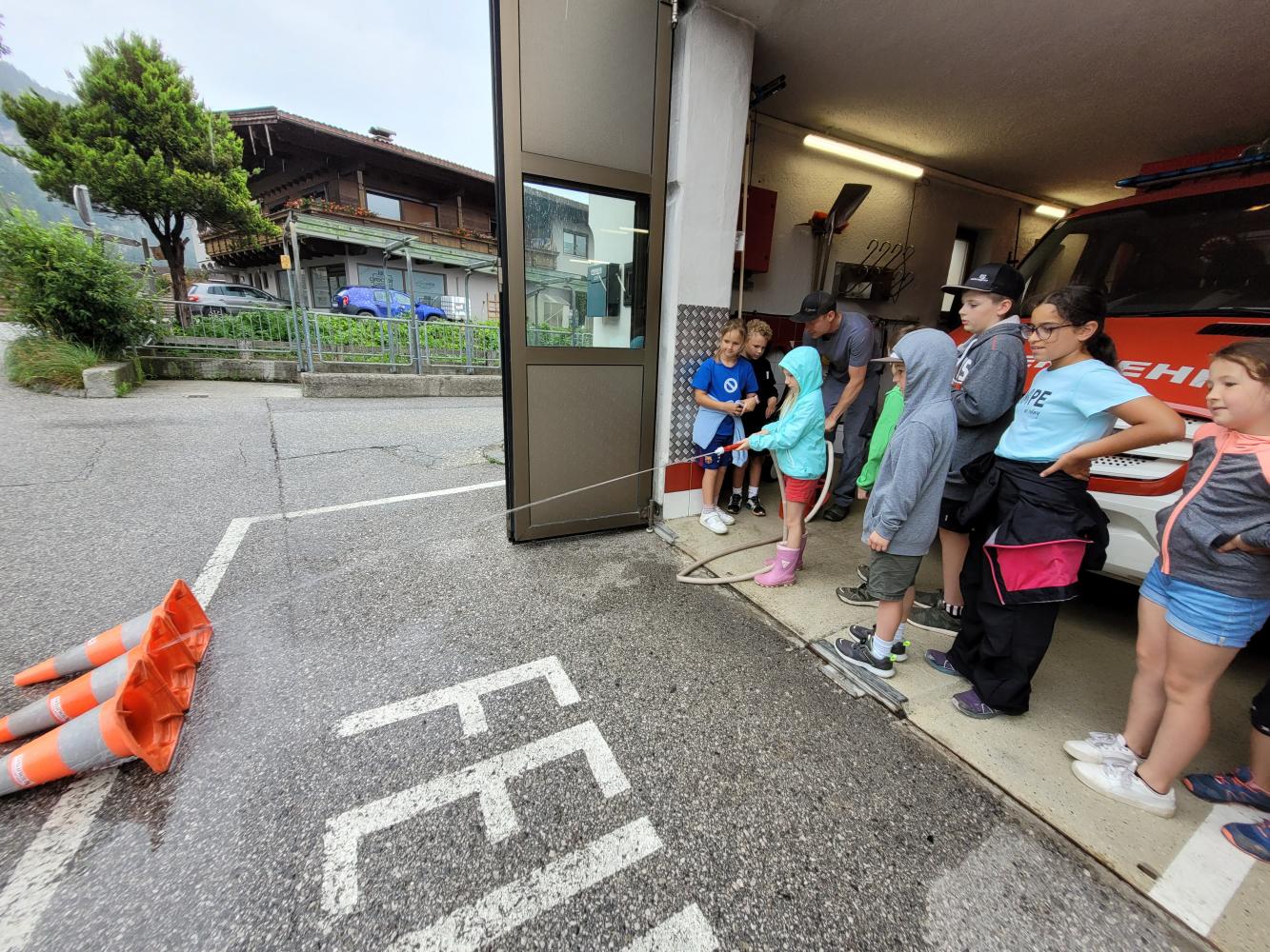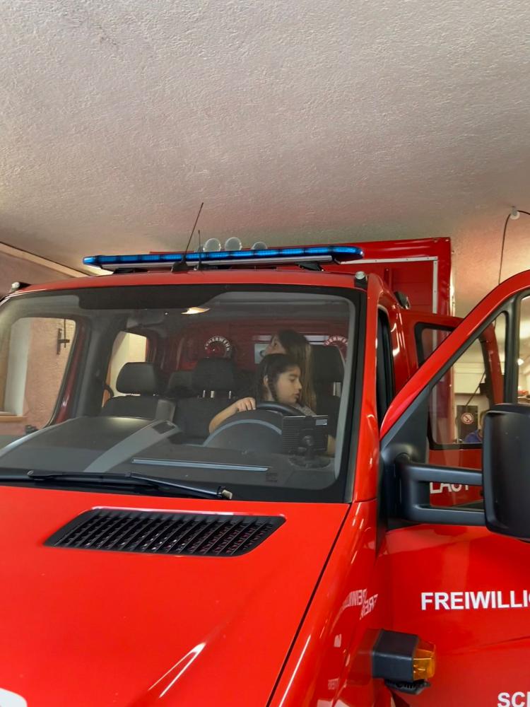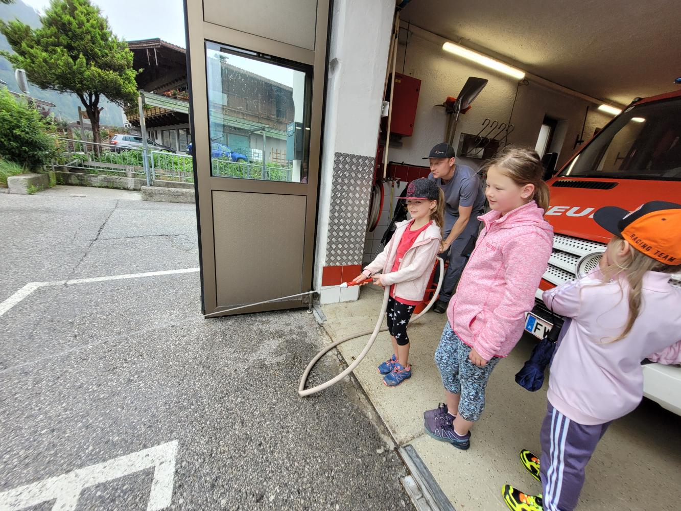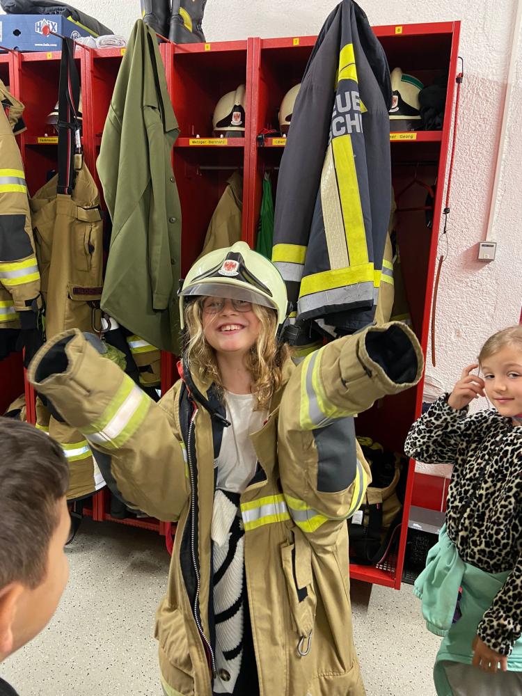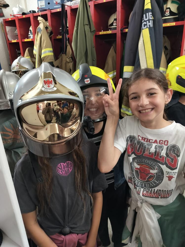 Die Feuerwehrmänner Fabian und Marco empfingen die Kinder im Feuerwehrhaus. Neben den verschiedenen Feuerwehrautos konnten auch die diversen Gerätschaften bestaunt und ausprobiert werden. Viel Spaß machte den Kindern das Zielspritzen mit den Hütchen. Zum Schluss wurden noch alle Klassen mit den Feuerwehrautos in die Schule gebracht.