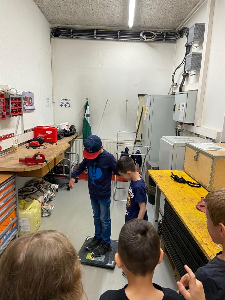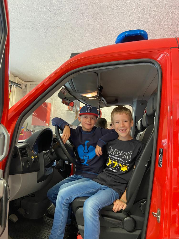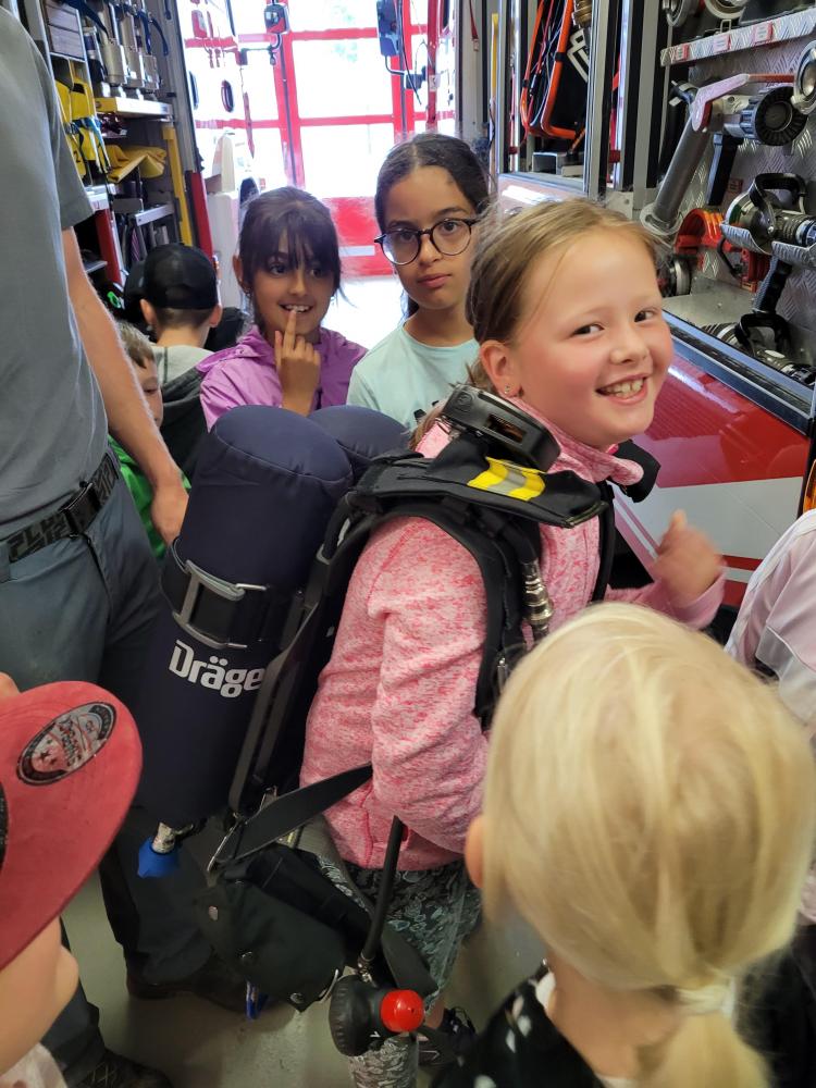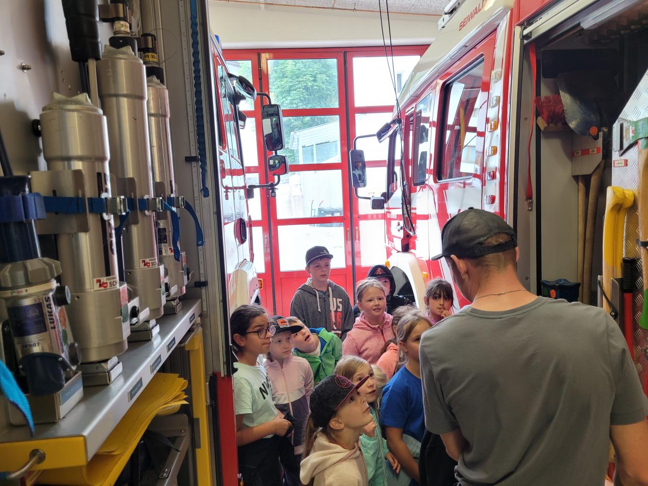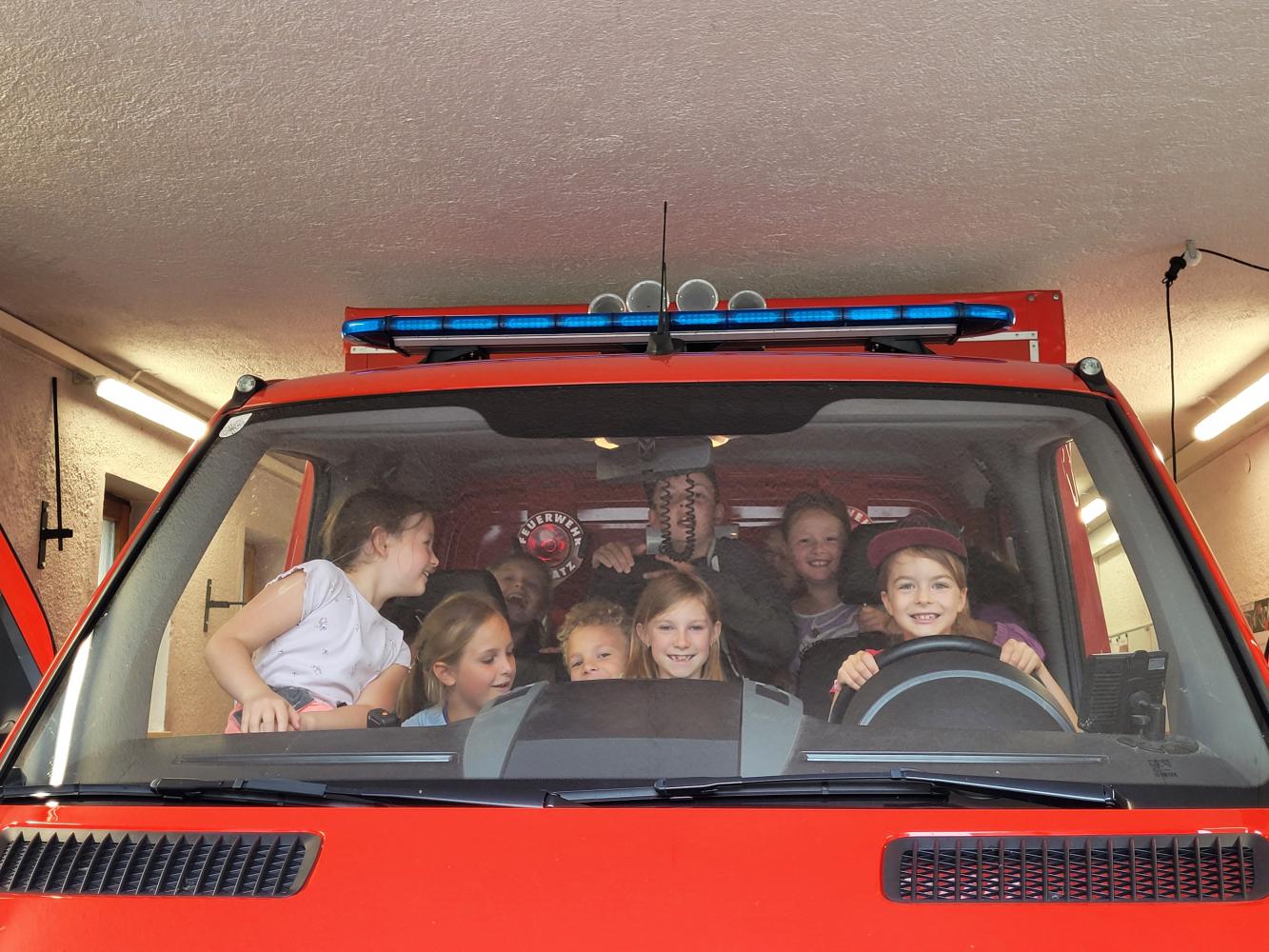 Die Feuerwehrmänner Fabian und Marco empfingen die Kinder im Feuerwehrhaus. Neben den verschiedenen Feuerwehrautos konnten auch die diversen Gerätschaften bestaunt und ausprobiert werden. Viel Spaß machte den Kindern das Zielspritzen mit den Hütchen. Zum Schluss wurden noch alle Klassen mit den Feuerwehrautos in die Schule gebracht.