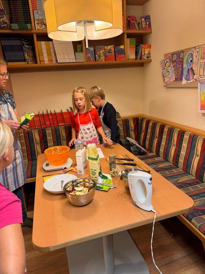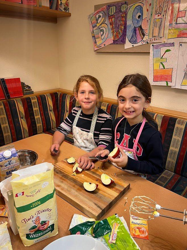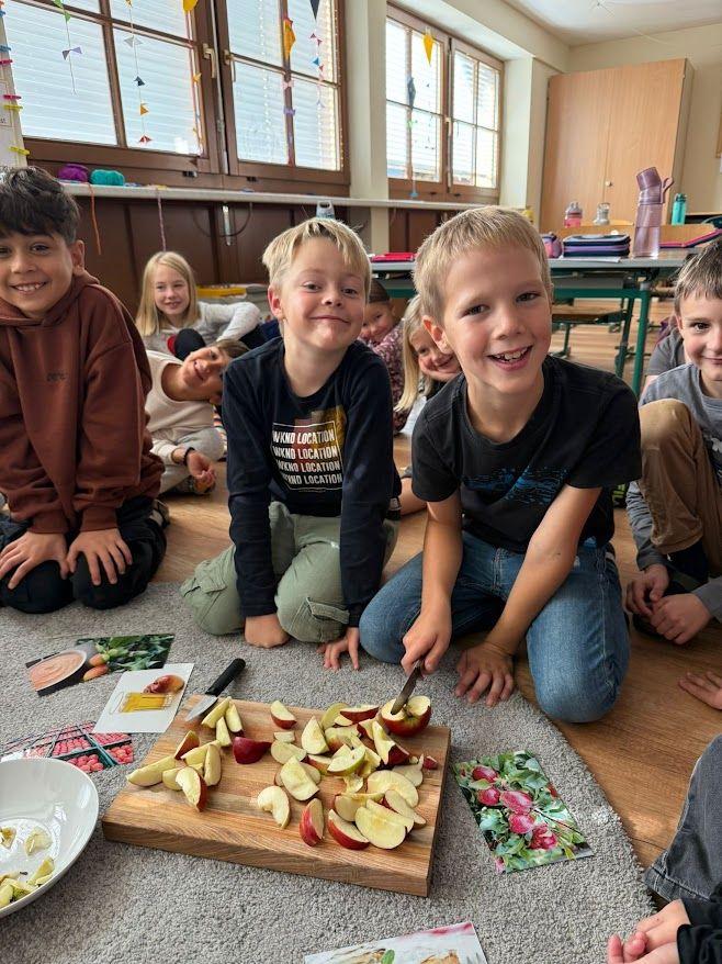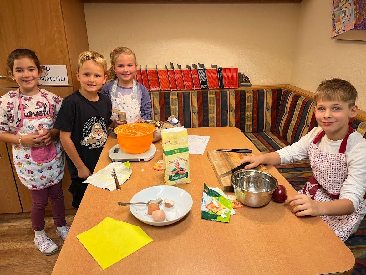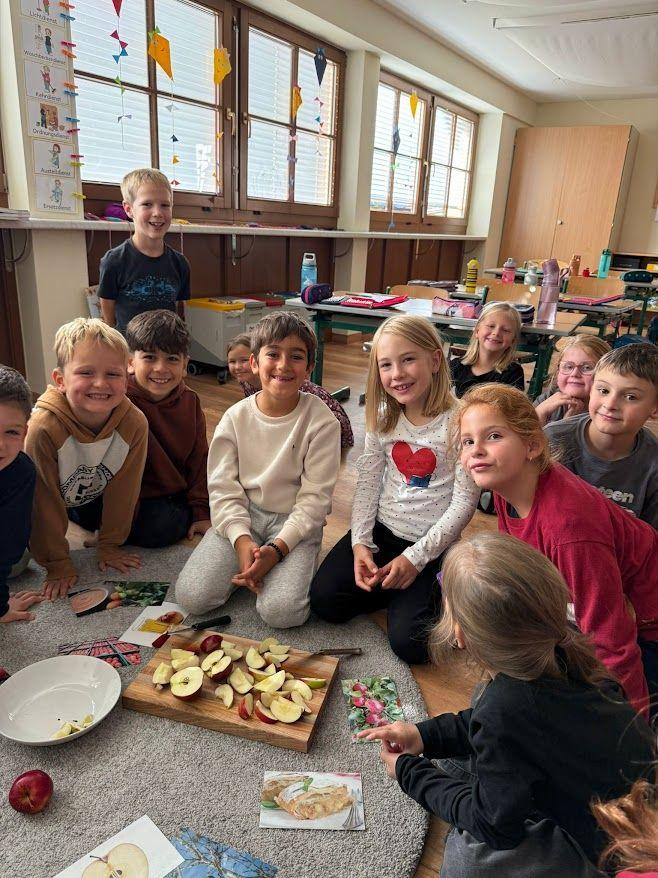 Nachdem wir viel über den Apfel gelernt haben, durfte natürlich eine Kostprobe nicht fehlen. Lena aus der 2b brachte viele Äpfel aus ihrem Garten mit und so konnten wir einen leckeren Apfelkuchen backen. Die Kinder wurden in Kleingruppen eingeteilt und konnten so in der Küche gemeinsam den Teig zubereiten. Besonders viel Spaß machte den Kindern das Schneiden der Äpfel und das Verrühren mit dem Mixer. Voller Stolz und Freude nahmen die Kinder ihren eigenen kleinen Apfelkuchen mit nach Hause.