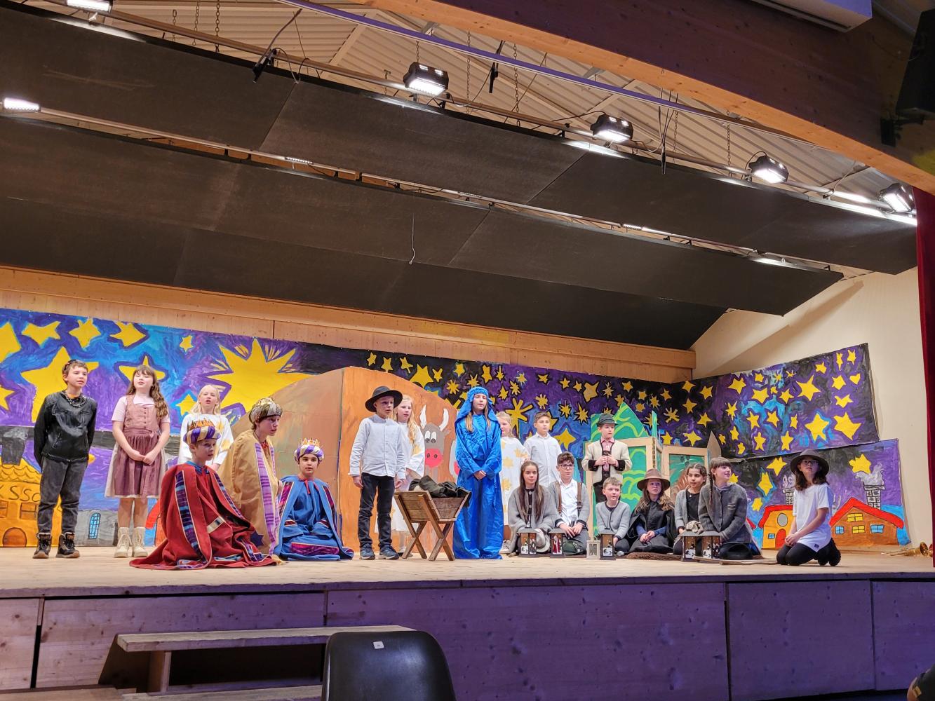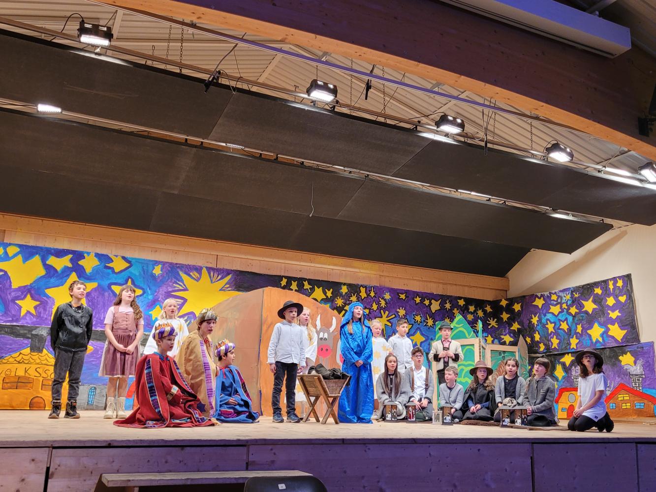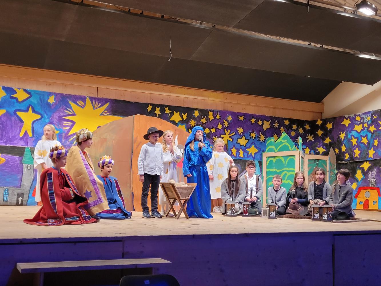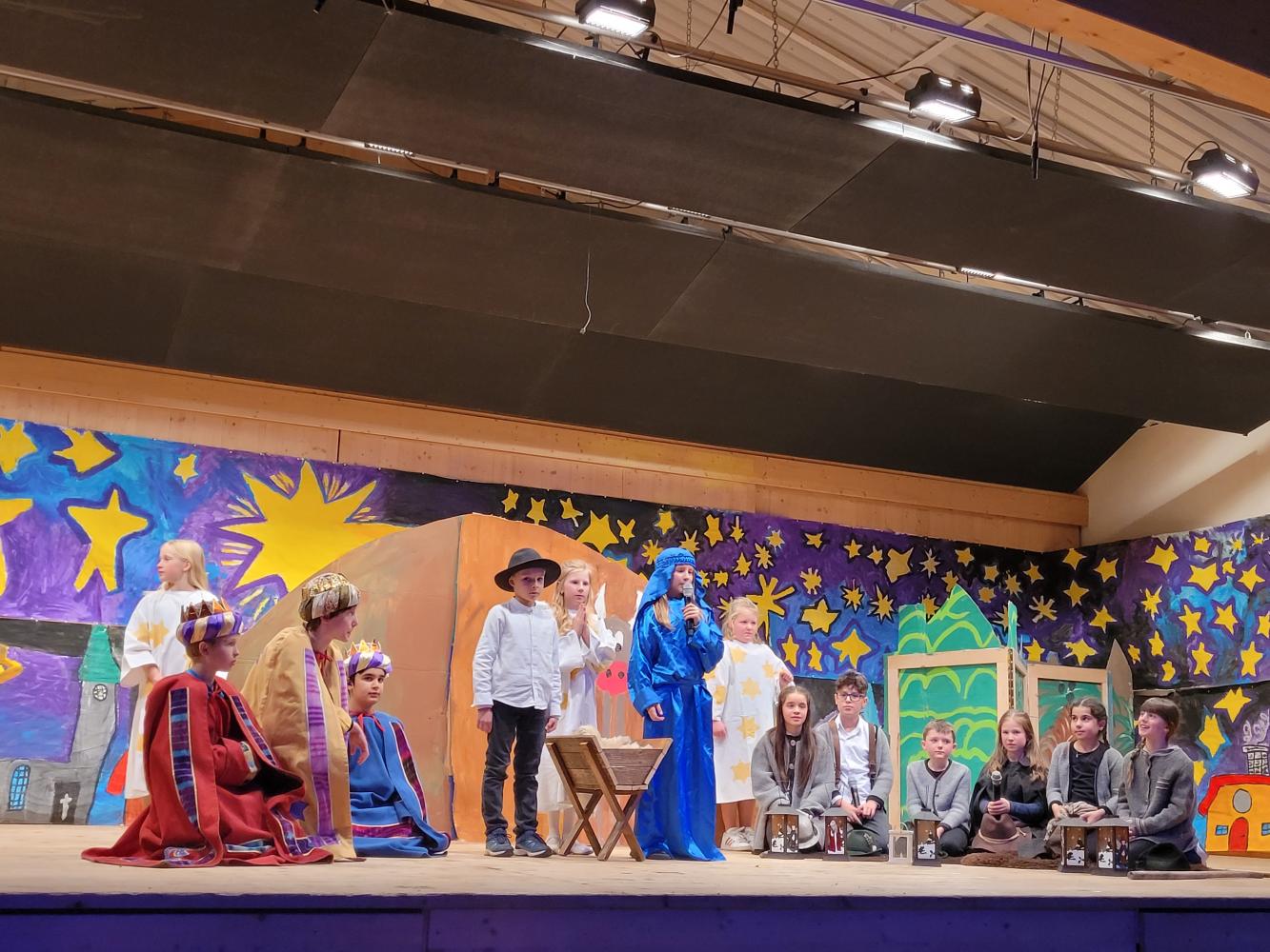 In der gut gefüllten Festhalle boten die 4.Klässler einen gelungenen und farbenfrohen Auftritt und schlüpften in die Rollen der Weihnachtsgeschichte. Sowohl die dritte als auch die beiden zweiten Klassen begleiteten das Krippenspiel musikalisch. Als krönenden Abschluss spielte die Bläsergruppe noch ein paar Weihnachtslieder. Nach dem Stück verwöhnten uns die Eltern der 4.Klasse mit einem herrlichen Buffet.
