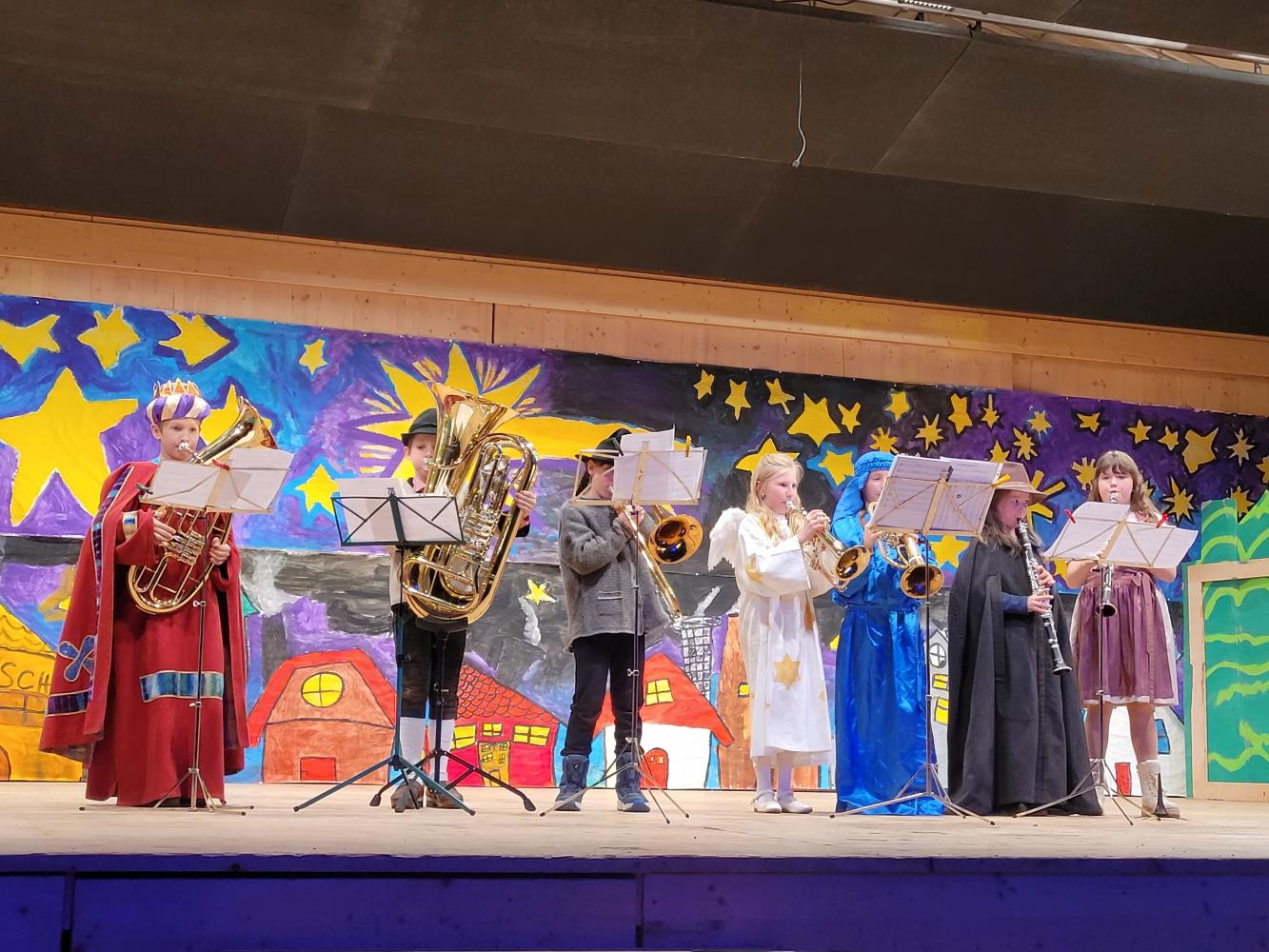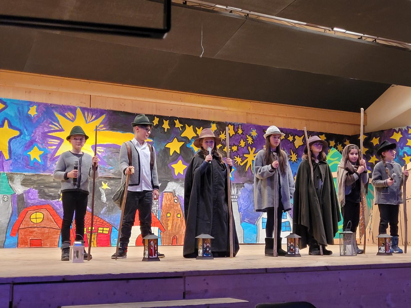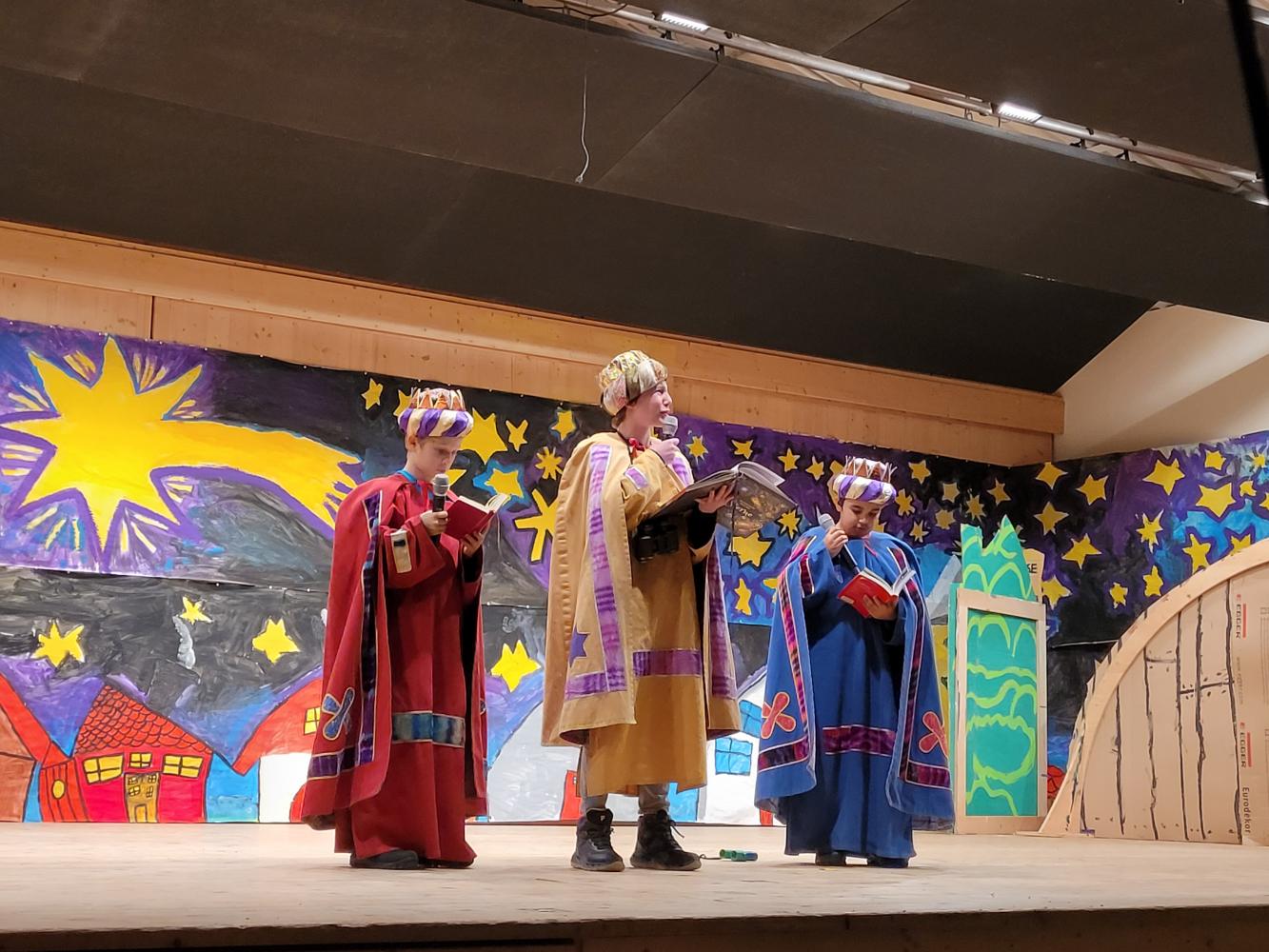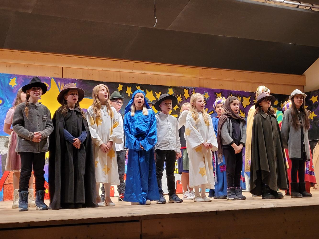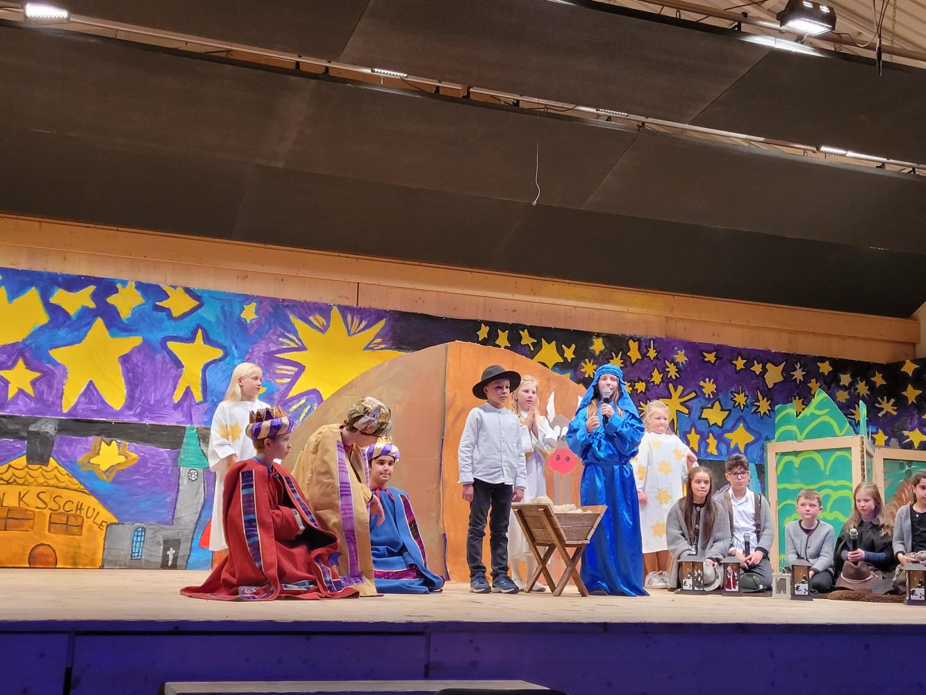 In der gut gefüllten Festhalle boten die 4.Klässler einen gelungenen und farbenfrohen Auftritt und schlüpften in die Rollen der Weihnachtsgeschichte. Sowohl die dritte als auch die beiden zweiten Klassen begleiteten das Krippenspiel musikalisch. Als krönenden Abschluss spielte die Bläsergruppe noch ein paar Weihnachtslieder. Nach dem Stück verwöhnten uns die Eltern der 4.Klasse mit einem herrlichen Buffet.