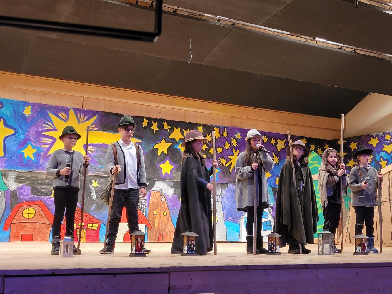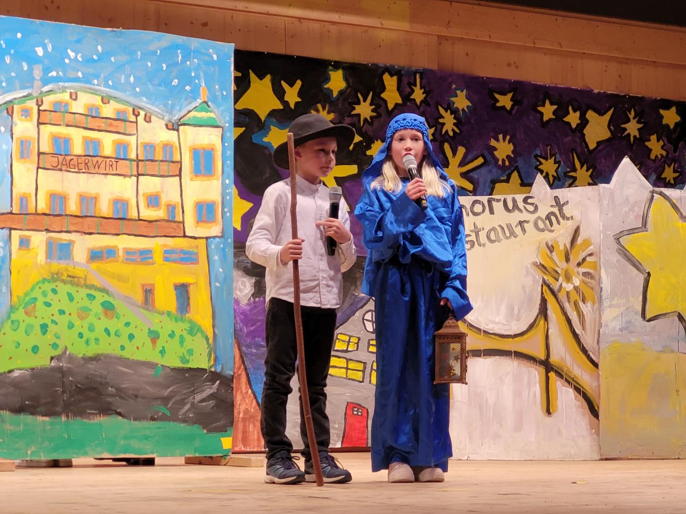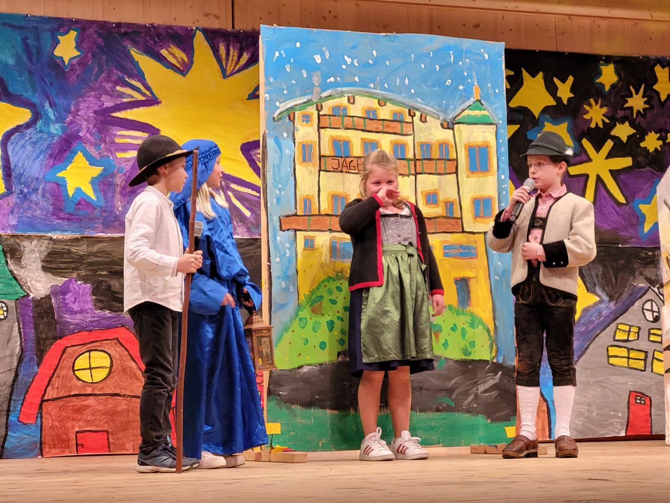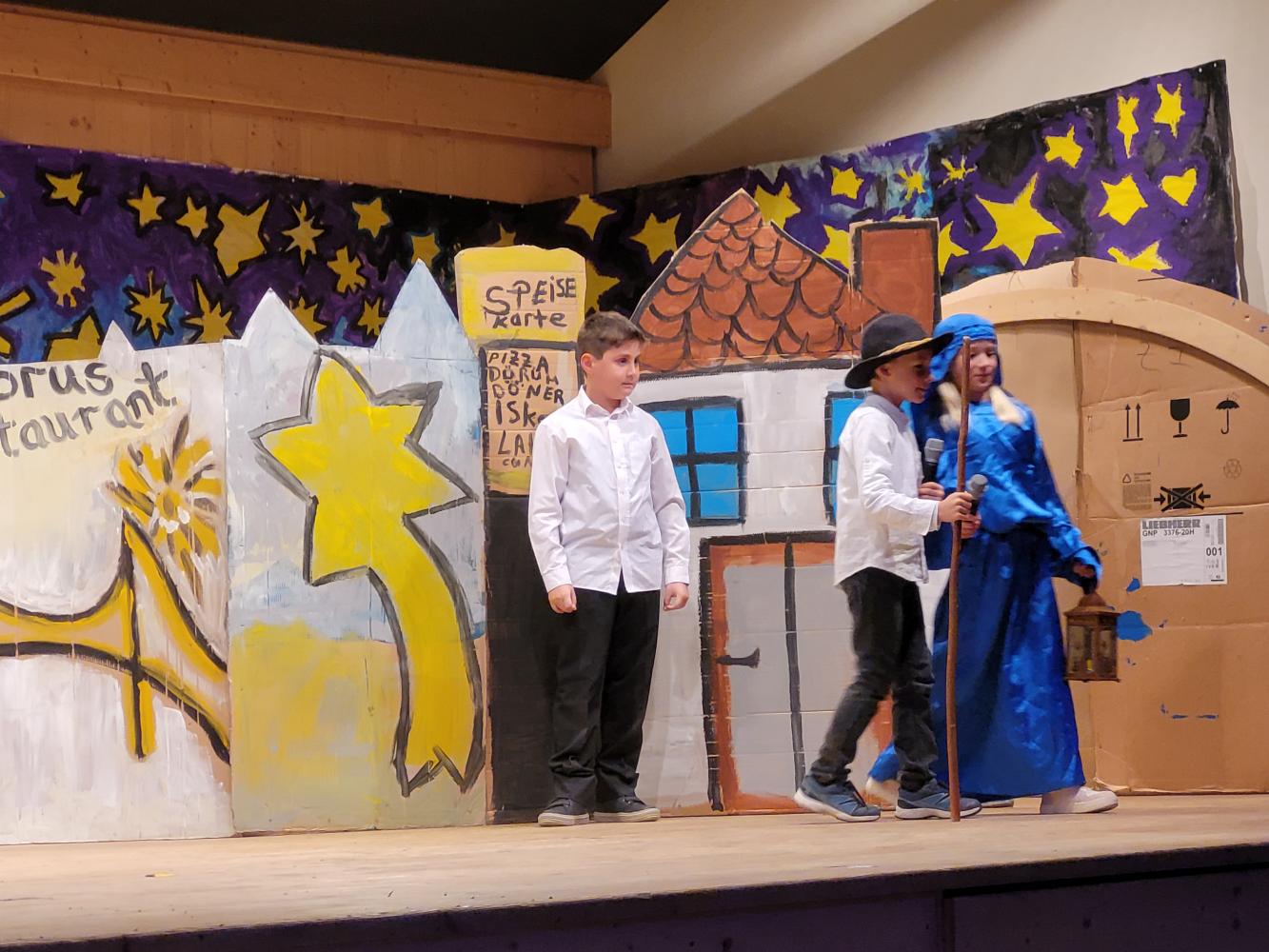 In der gut gefüllten Festhalle boten die 4.Klässler einen gelungenen und farbenfrohen Auftritt und schlüpften in die Rollen der Weihnachtsgeschichte. Sowohl die dritte als auch die beiden zweiten Klassen begleiteten das Krippenspiel musikalisch. Als krönenden Abschluss spielte die Bläsergruppe noch ein paar Weihnachtslieder. Nach dem Stück verwöhnten uns die Eltern der 4.Klasse mit einem herrlichen Buffet.