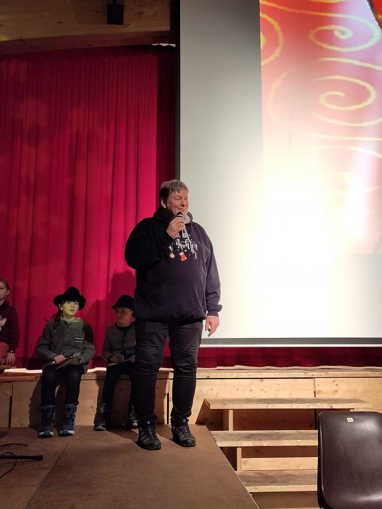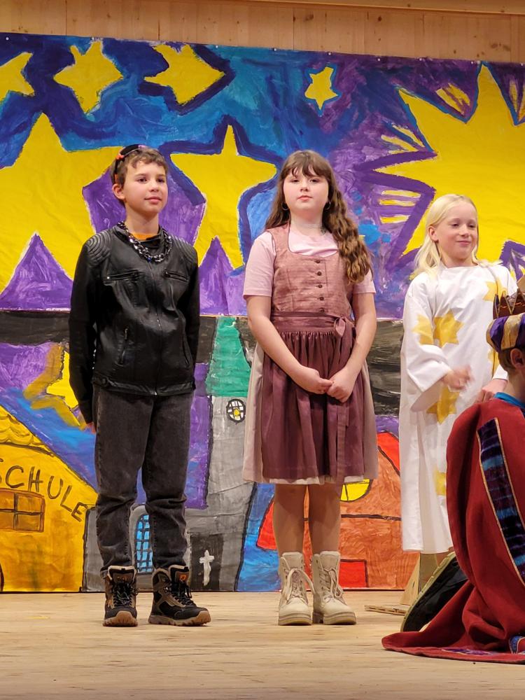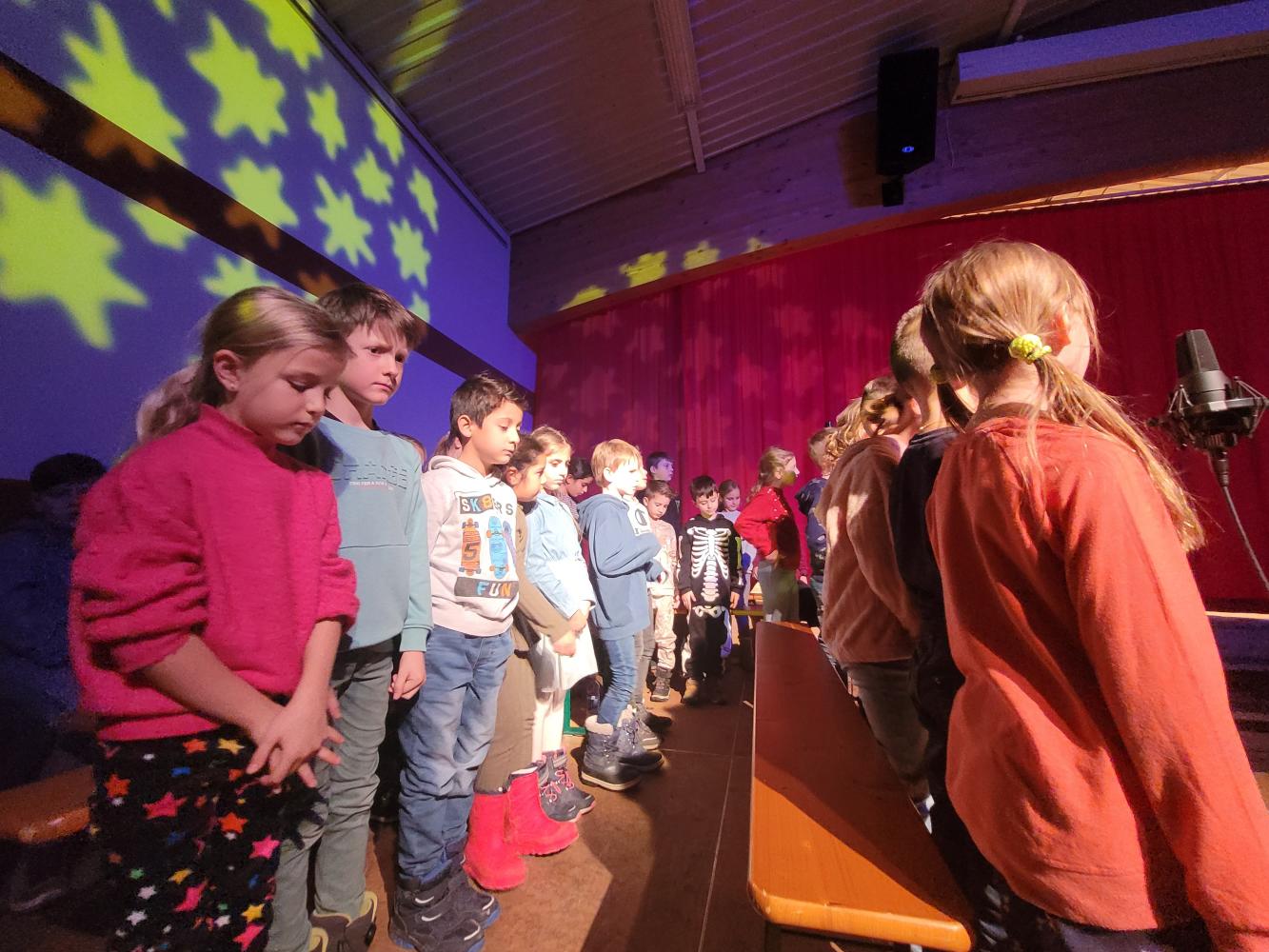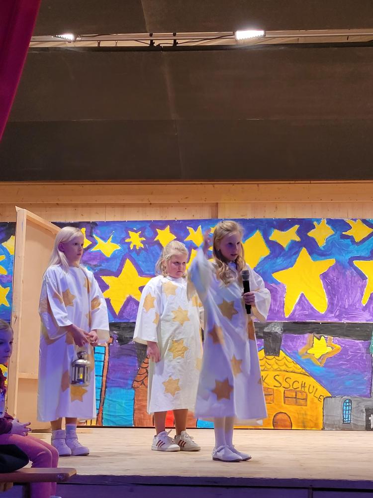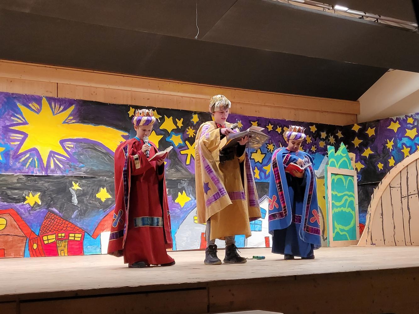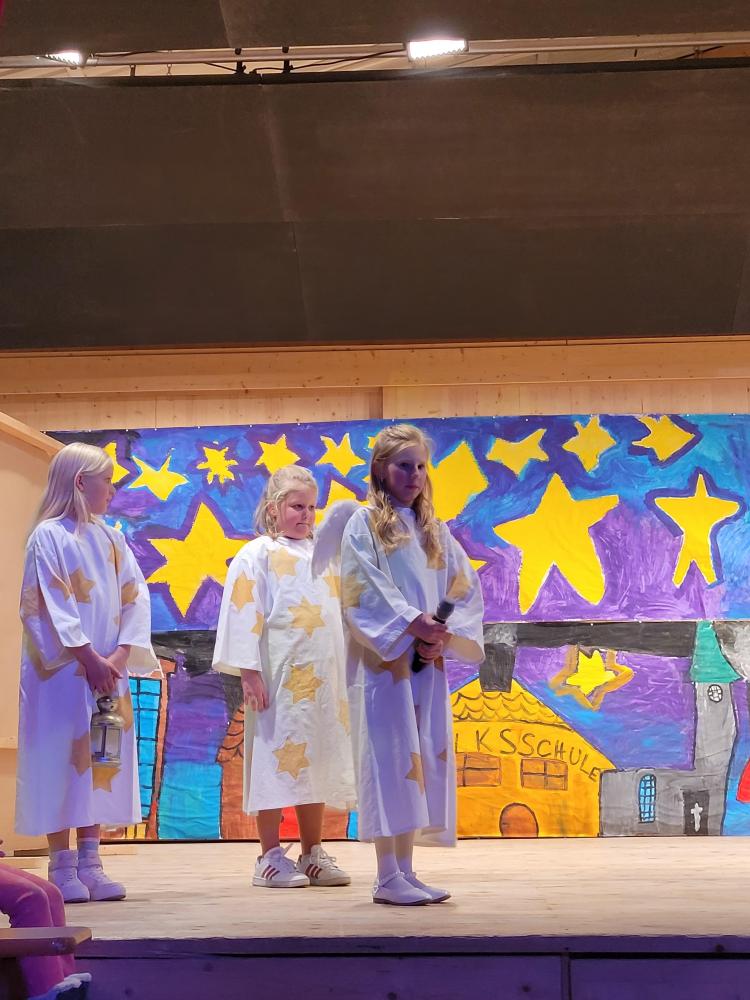 In der gut gefüllten Festhalle boten die 4.Klässler einen gelungenen und farbenfrohen Auftritt und schlüpften in die Rollen der Weihnachtsgeschichte. Sowohl die dritte als auch die beiden zweiten Klassen begleiteten das Krippenspiel musikalisch. Als krönenden Abschluss spielte die Bläsergruppe noch ein paar Weihnachtslieder. Nach dem Stück verwöhnten uns die Eltern der 4.Klasse mit einem herrlichen Buffet.